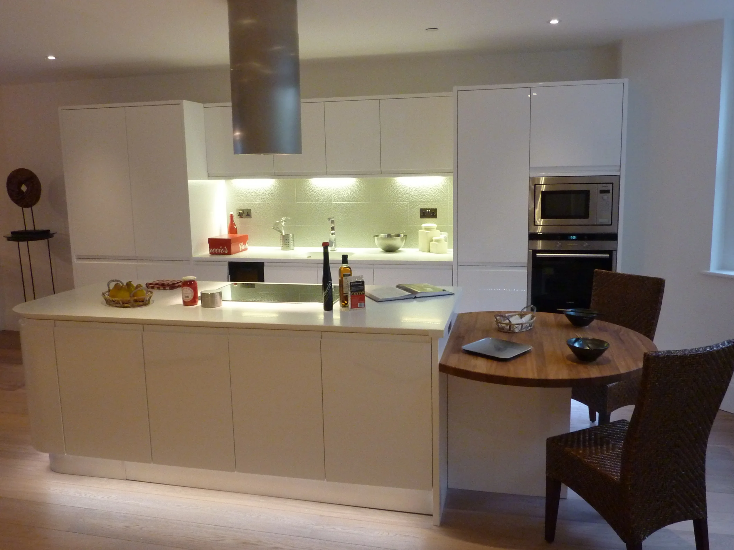 Making the most of the open plan space, this kitchen scheme was installed with feature curves including a curved breakfast area in iroko. The handless design included glacial white corian with sharknose edge detail. Siemens induction hob, single oven, micowave and dishwasher were installed along with hood and wine chiller from caple. LED Plinth and under pelmet lighting gave another ambiance to this space.